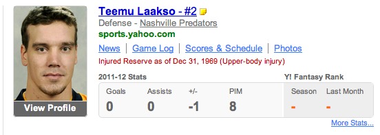 - Say so long to Teemu Laakso, for he has been placed on waivers. After suffering an injury that placed him on the IR, the Predators felt it necessary to part ways with the young defenseman. If you look at Yahoo! Sports, it’ll tell you Teemu has been injured since December 31st… 1969. Yea, you read that correctly. He was actually injured back on November 8th against the LA Kings. But hey, 2011/1969… pretty close, right? We thank you for the laugh, Yahoo! Sports and we know it was just a glitch error, but we still laugh.