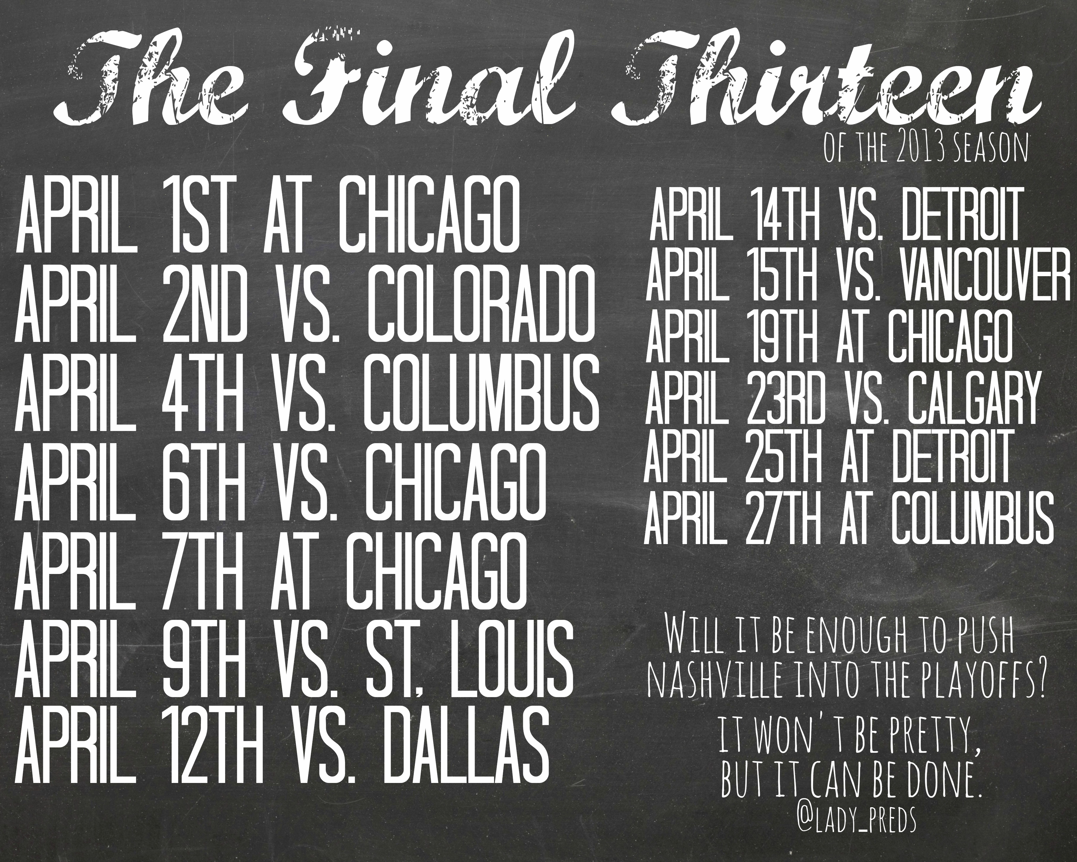 Let’s start out on an honest foot: Brutal final thirteen? I’m pretty sure this entire season has been brutal for Nashville. But alas, these last thirteen games, which start tomorrow in Chicago, will test the Predators in more ways than one.